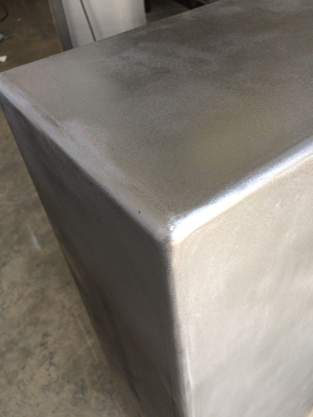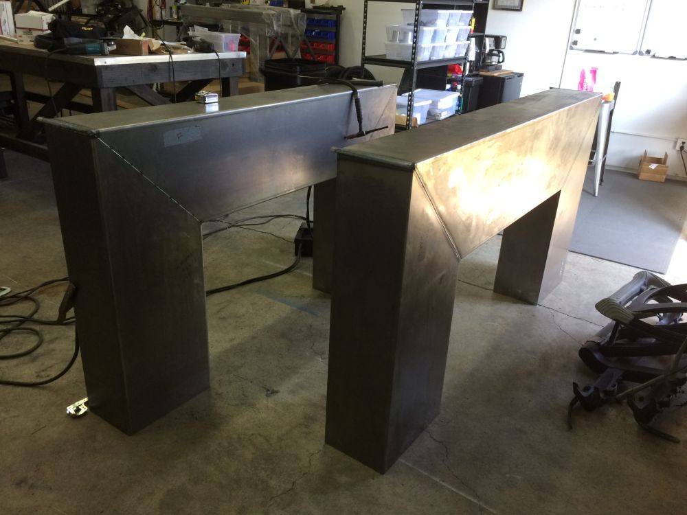They had a pretty good idea of what they wanted when we started designing. One constraint was a 3/4″ radius all around. This is to match the custom concrete work that these metal surrounds will rest on. The construction is 1/8″ CRS plate. This material lends itself to clean, sharp looks. The formed radius on all the corners gives a uniformed, machined look to it. The only problem when doing this, is that the edge that returns to the wall is a welded edge, not formed like the rest. Getting this joint to match the others is the real challenge. My designer suggested cutting a section from a tube and welding iot into place for the radius. This worked well and took less time than I expected. For the two full radeus corners, I cut a metal ball into sections and fit it in to accept both radii. This is one of those jobs that “clean up” , meaning grinding, polishing and “hiding” the weld takes about 10x more time than the welding itself. The whole unit attaches to the wall via keyhole slots welded to the back edge of the structure. The second challenge of this job was the finish. I was given a picture frame from their home to match the color and finish. This is the topic of its own post later…..