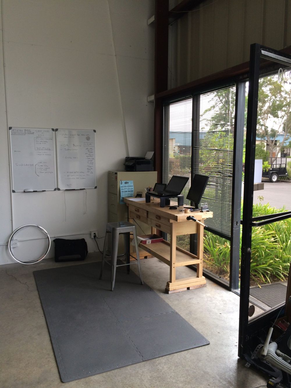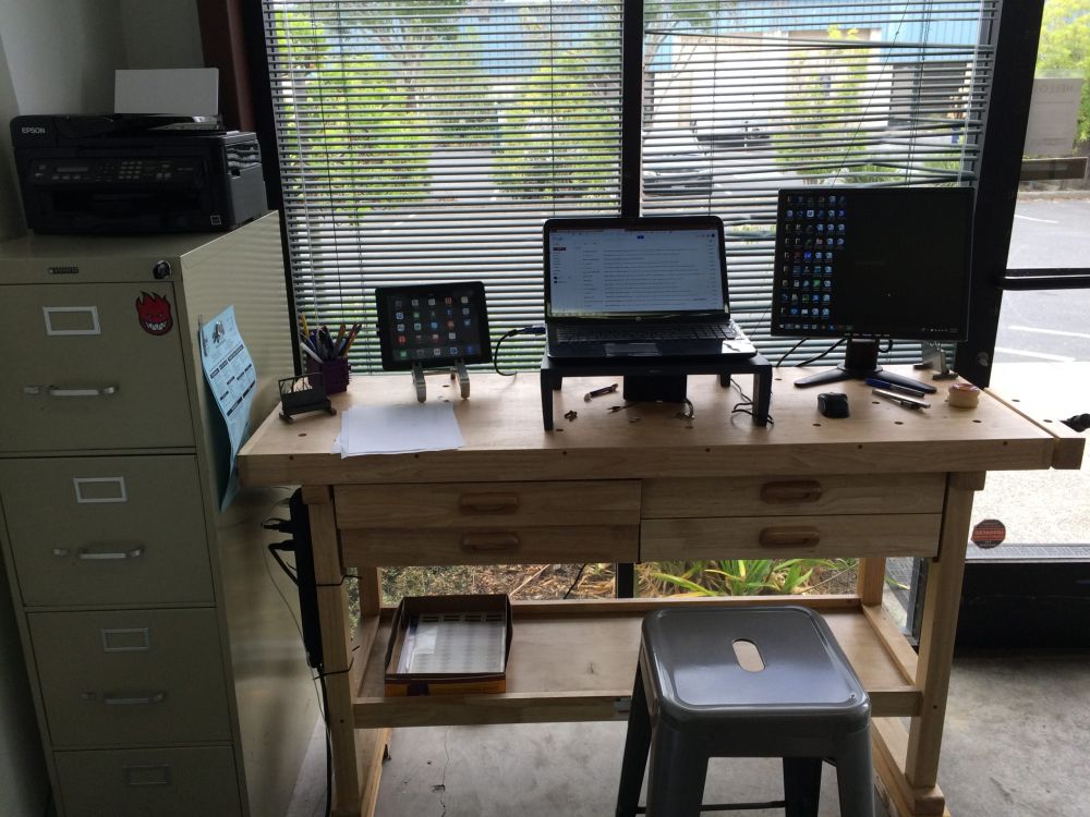 FINALLY! I finally have wifi at the new Trueform Shop. I spent a part of yesterday morning setting up the office space. I have adopted a stand up desk for office work. I think it helps with productivity and adds more movement to my day. My desk is a Harbor Freight Special but I love it. I though you might like a few shots of my new office. I’m sure its not like many you have seen. I guess this is due to the fact that I really don’t have an office job…. While more and more work is done through computers, I am really a machinist. I can take three steps and I am at my workbench, mill, welding table,etc. This meager office area provides exactly what I need for the design, project management, research, purchasing and communication elements of my business. I hope you can come visit soon to see it in person. Take me up on my offer and Ill provide the hot or cold drinks…. See you soon.